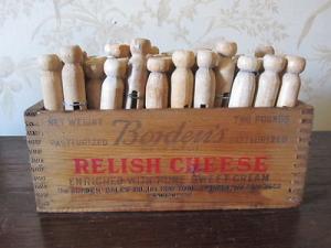 VINTAGE CLOTHESPINS IN PRIMITIVE BORDEN'S REPURPOSED ANTIQUE WOOD CHEESE BOX
