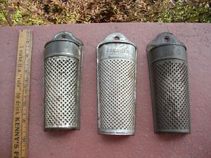 3 EARLY Antique Tin Nutmeg Graters Primitive Kitchen Utensils ALL MARKED