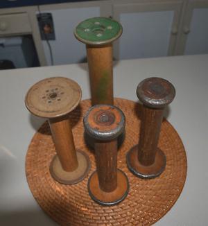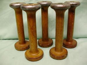 5 WOODEN SILK SPOOLS, BOBBINS 4" NICE PATINA!!!
