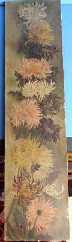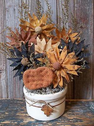 Primitive Fall/Harvest Decoration - Fabric Daisies & Pumpkin in Small Old Crock