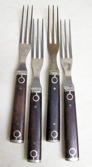 4 ANTIQUE OLD PRIMITIVE WOODEN& METAL CIVIL WAR ERA FLATWARE 3 TINE FORKS