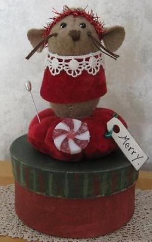 PRIMITIVE MOUSE CHRISTMAS CANDY TREAT BUTTON BOX MAKE DO DOLL PIN CUSHION PFATT
