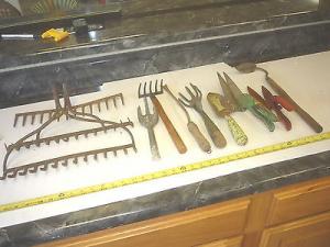 3 OLD ANTIQUE FARM GARDEN RAKE WINE GLASS & MANY GARDEN TOOLS