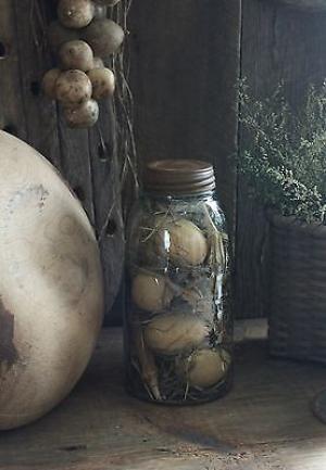 Primitive Lidded Glass Canning Jar w/Dried Egg Gourds/Okra & Aged Raffia Grass