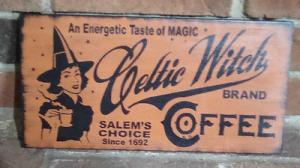 Primiive Naive Halloween KITCHEN WITCH SIGN “CELTIC WITCH BRAND COFFEE” Hp