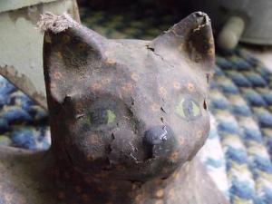 Primitive Antique Plaster Door Stop Calico Covered Cat Shaped Americana Folk Art