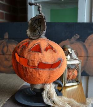 PRIMITIVE Halloween Pumpkin LIGHT UP Jack O Lantern CandLe Holder Base StoneMt