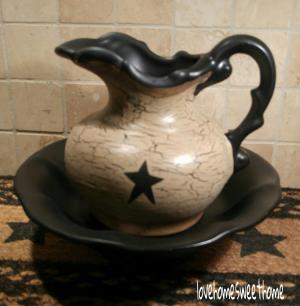 Primitive Crackle Tan & Black Star Ceramic Pitcher & Bowl Set ~ Country Decor