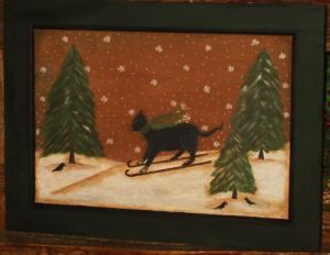 *~*PRIMITIVE*~* HP FOLK ART BLACK CAT SKIING ~ WINTER ~ DOOR PANEL
