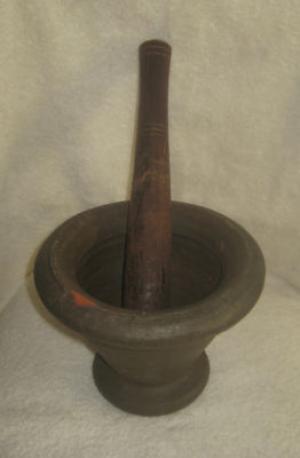 VERY OLD ANTIQUE STONE MORTAR AND WOOD PESTLE USED FOR FOOD