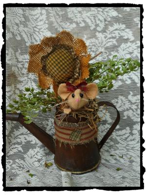 Handmade *Primitive *Mouse* in Rusty Watering Can Burlap*Grungy Sunflower`OOAK*