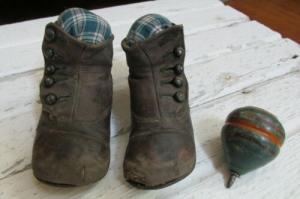 Child''s Antique Shoes, Antique Wooden Top, Country, Farm, Pirmitive
