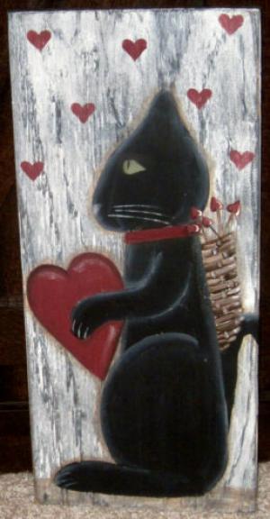 *~*PRIMITIVE*~* HP FOLK ART PRIM BLACK CAT *~* VALENTINE *~* HEART *~* BOARD