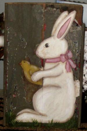 *~*PRIMITIVE*~* HP FOLK ART PRIM BUNNY *~* CHICK *~* EASTER *~* RECLAIMED WOOD