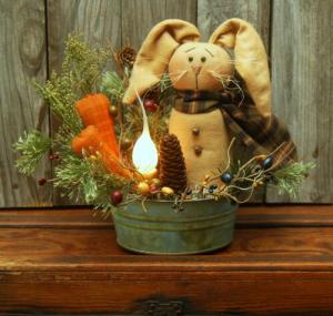 HANDMADE PRIMITIVE SPRING BUNNY RABBIT CARROTS CANDLE LAMP BUCKET FOLK ART