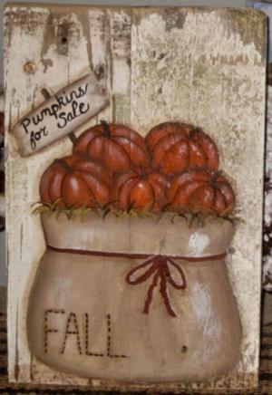 *~*PRIMITIVE*~* HP FOLK ART FALL SACK *~* PUMPKINS FOR SALE *~* RECLAIMED WOOD