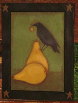 *~*PRIMITIVE*~* HP FOLK ART CROW ~ PEARS ~ STAR *~* DOOR PANEL