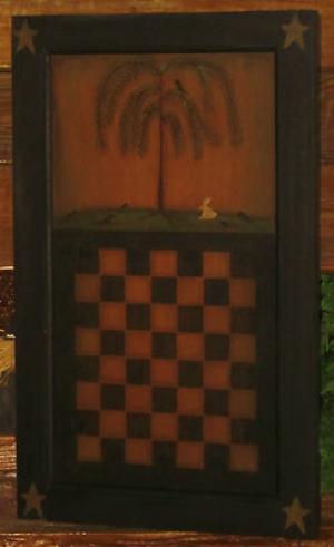 *~*PRIMITIVE*~* HP FOLK ART CHECKERBOARD ~ WILLOW ~ CROW ~ BUNNY ~ DOOR PANEL