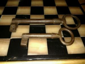 2 LARGE 18th C Antique Blacksmith Forged Wrought Iron Skeleton Jail House Keys