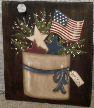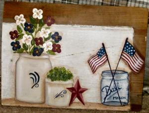 *~*PRIMITIVE*~* HP FOLK ART AMERICANA * CROCKS * BALL JAR * FLAG * STAR * BOARD