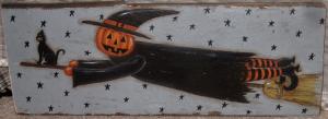 *~*PRIMITIVE*~* HP FOLK ART FLYING JACK-O-LANTERN WITCH * CAT *~* RECLAIMED WOOD