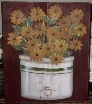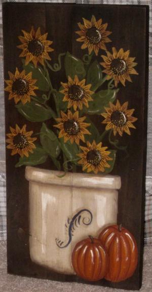 *~*PRIMITIVE*~* HP FOLK ART CROCK * SUNFLOWERS * PUMPKINS *~* RECLAIMED WOOD