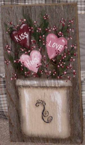 *~*PRIMITIVE*~* HP FOLK ART PRIM CROCK * HEARTS * VALENTINE * OLD RECLAIMED WOOD