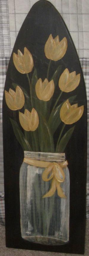 *~*PRIMITIVE*~* HP FOLK ART PRIM JAR OF TULIPS *~* SPRING *~* STRETCHER