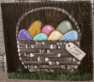 *~*PRIMITIVE*~* HP FOLK ART BASKET OF EGGS * CHICK * EASTER *~* RECLAIMED WOOD