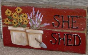 *~*PRIMITIVE*~* HP FOLK ART PRIM "SHE SHED" SIGN * SUNFLOWERS *~* RECLAIMED WOOD