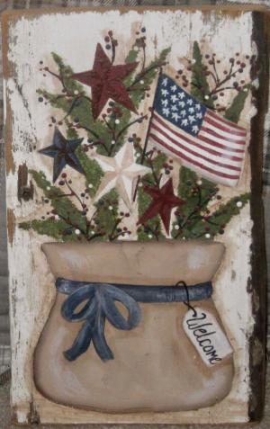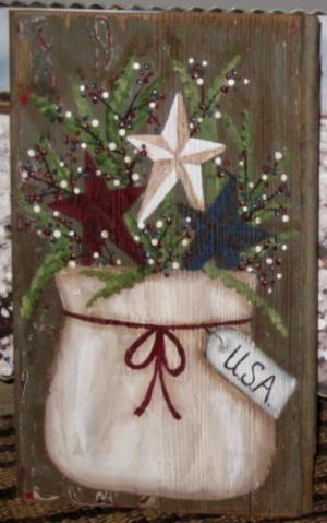*~*PRIMITIVE*~* HP FOLK ART PRIM AMERICANA SACK * FLAG * STARS *~*RECLAIMED WOOD
