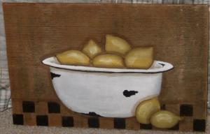 *~*PRIMITIVE*~* HP FOLK ART PRIM ENAMELWARE BOWL OF LEMONS *~* RECLAIMED WOOD