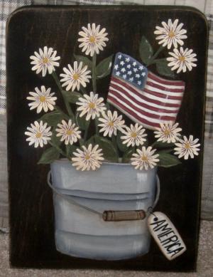 *~*PRIMITIVE*~* HP FOLK ART PRIM PAIL * DAISIES * FLAG * AMERICA * BOARD