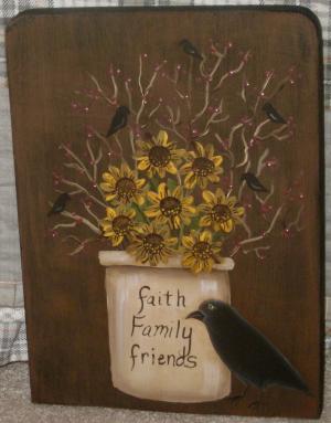 *~*PRIMITIVE*~* HP FOLK ART PRIM CROCK *~* SUNFLOWERS *~* CROW *~* RECLAIM WOOD