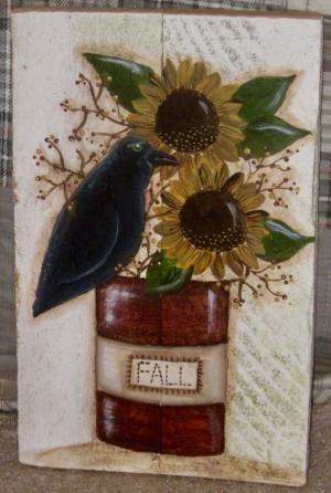 *~*PRIMITIVE*~* HP FOLK ART PRIM JAR * CROW * SUNFLOWERS * FALL * RECLAIMED WOOD