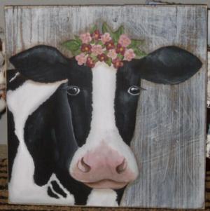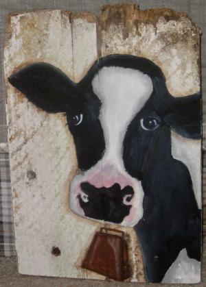 *~*PRIMITIVE*~* HP FOLK ART PRIM BLACK & WHITE COW *~* OLD RECLAIMED WOOD