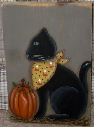 *~*PRIMITIVE*~* HP FOLK ART PRIM BLACK CAT * PUMPKIN * FALL * RECLAIMED WOOD