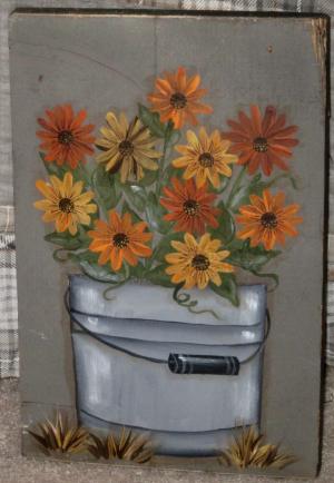 *~*PRIMITIVE*~* HP FOLK ART PRIM PAIL *~* SUNFLOWERS *~* FALL *~* RECLAIMED WOOD