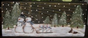 *~*PRIMITIVE*~* HP FOLK ART SNOWMEN FAMILY SLEDDING ~ WINTER ~ DOOR PANEL