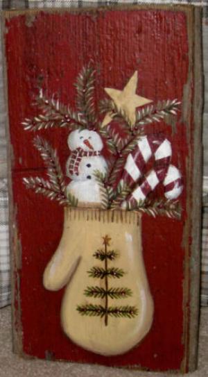 *~*PRIMITIVE*~* HP FOLK ART PRIM WINTER MITTEN *~* SNOWMEN *~* RECLAIMED WOOD