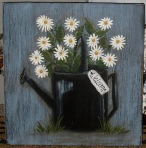 *~*PRIMITIVE*~* HP FOLK ART WATERING CAN * DAISIES * WELCOME * RECLAIMED WOOD