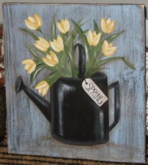 *~*PRIMITIVE*~* HP FOLK ART PRIM WATERING CAN * TULIPS * SPRING * RECLAIMED WOOD