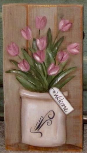 *~*PRIMITIVE*~* HP FOLK ART PRIM CROCK *~* TULIPS *~* WELCOME *~* RECLAIMED WOOD