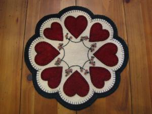 PRIMITIVE WOOL FELT PENNY RUG CANDLE MAT WITH RED VALENTINE HEARTS