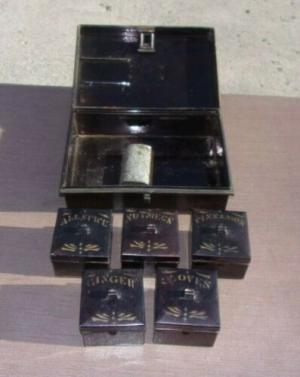 Antique Victorian Tin Spice Box W/5 Tole Painted Spice Tins & Nutmeg Grinder