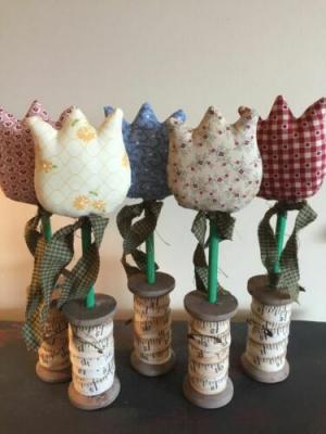 PRIMITIVE RAGGEDY SPRING EASTER BOBBIN FLOWERS -SET 0F 5