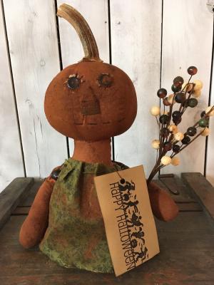 Primitive Halloween Doll Pumpkin Folk Art Doll Berries 11" Real Pumpkin Stem