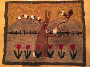 20” By 24 1/2” Hand Hooked Rug - Primitive Springtime Rabbit W/Chick 2006 Signed