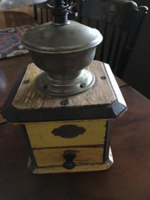Antique Coffee Grinder In Old Worn Yellow Paint