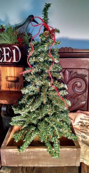 18" PRIMITIVE CHRISTMAS TREE in WOODEN BOX +VTG JINGLE BELL ~ APPALACHIAN CHARM